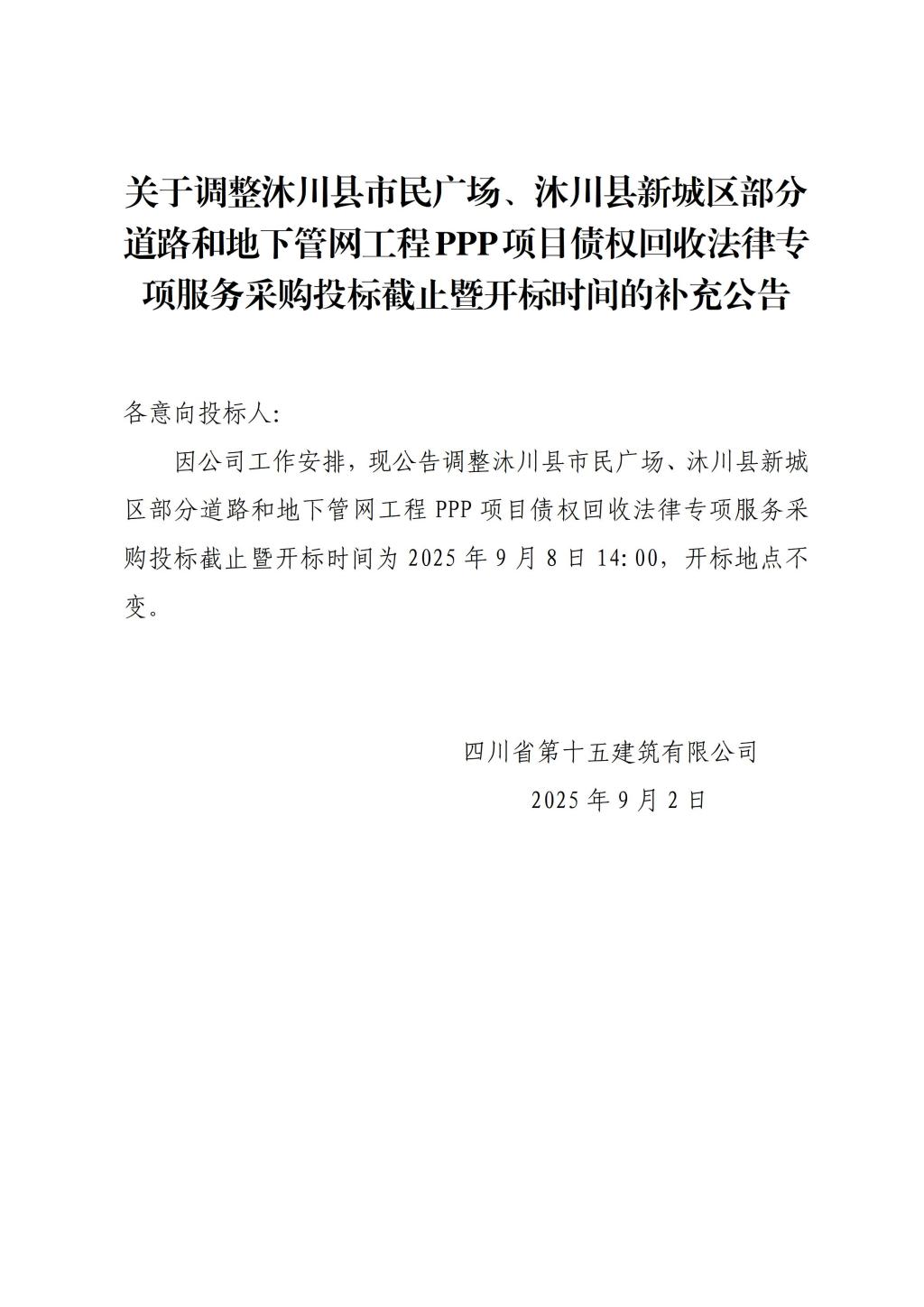 上一条:沐川县市民广场、沐川县新城区部分道路和地下管网工程PPP项目债权回收法律专项服务机构结果公告 下一条:沐川县市民广场、沐川县新城区部分道路和地下管网工程PPP项目债权回收法律专项服务公开招标公告