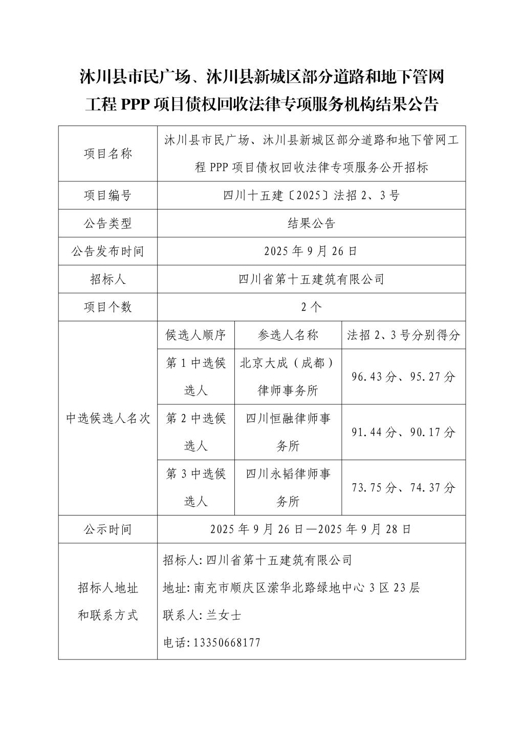 沐川县市民广场、沐川县新城区部分道路和地下管网工程PPP项目债权回收法律专项服务机构结果公告